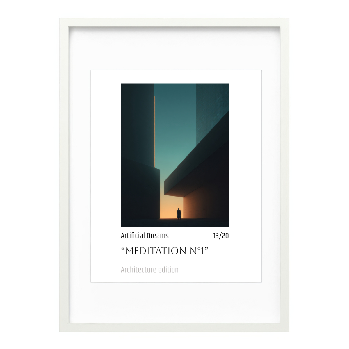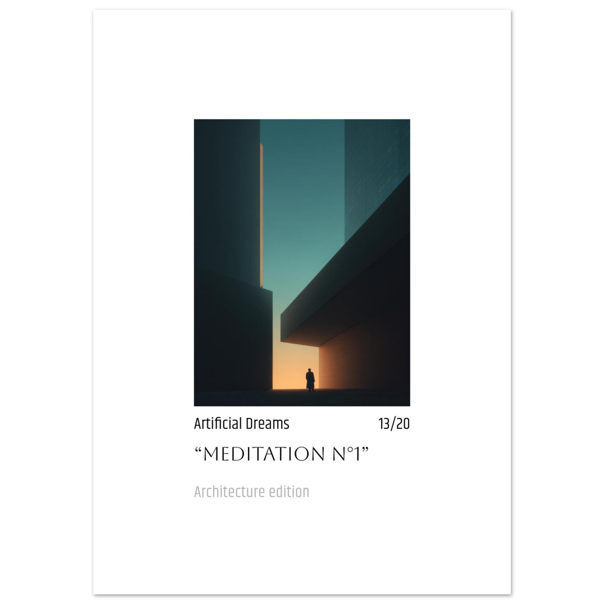 Immerse yourself in the captivating serenity of “Meditation N°1,” a fine art print that masterfully blends stark architectural lines with the soft, ethereal glow of a setting sun. This piece evokes a sense of contemplative solitude amidst a modern landscape, making it a perfect statement for any contemporary space seeking depth and tranquility. Experience how rich, deep hues transition from teal to a warm, inviting amber, creating a profound visual narrative that invites introspection.