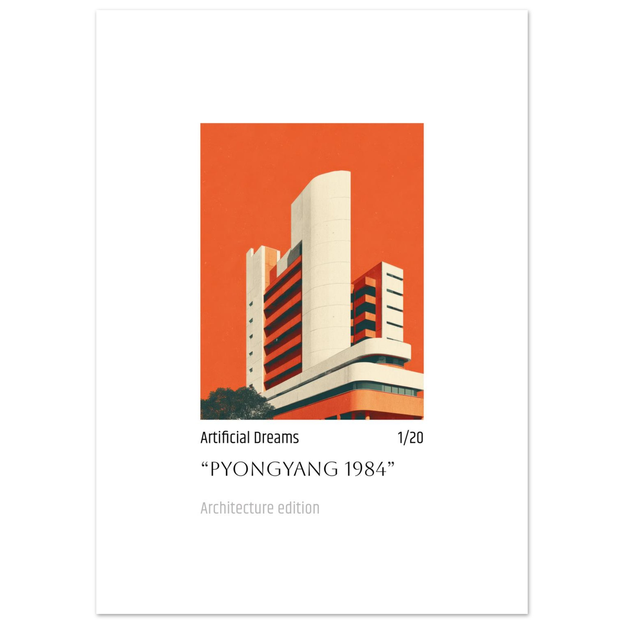 Immerse yourself in the striking aesthetics of “Pyongyang 1984,” a retro-futurist architectural fine art poster that captures a distinct, almost dreamlike urban landscape against a vivid orange backdrop. This piece, with its clean lines and bold color palette, evokes a sense of nostalgia for a future that never was, making it a perfect statement piece for any modern or eclectic interior.