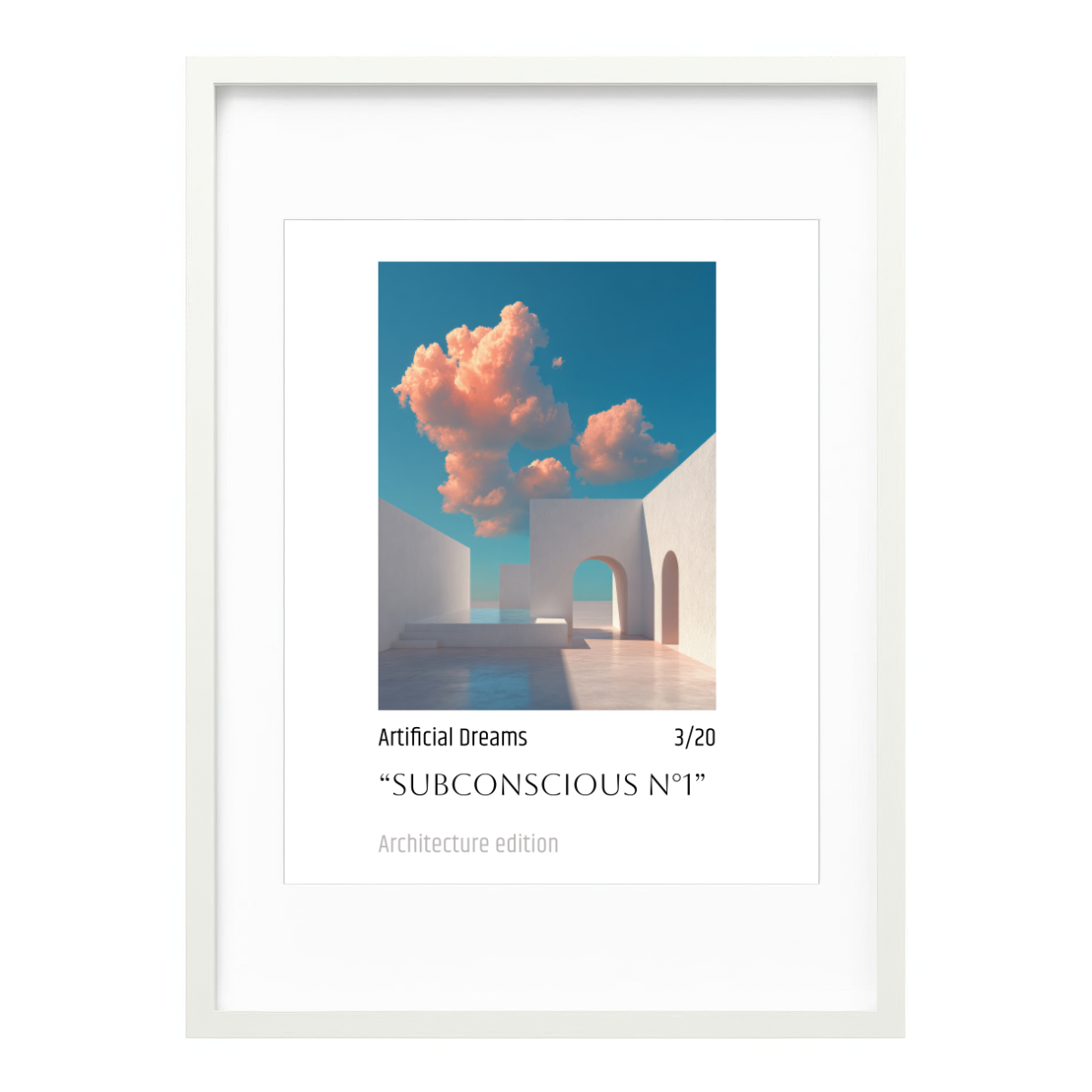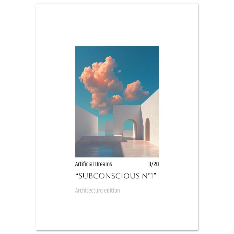 Unveil a moment of serene contemplation with our “Subconscious N°1” Fine Art Poster. This captivating artwork, part of the Architecture edition, transports you to a tranquil, dreamlike landscape where soft coral clouds drift over minimalist white structures and still, reflective water. The interplay of warm pastel hues against a vivid turquoise sky creates a sense of peaceful escapism, making it a perfect statement piece for any modern interior.