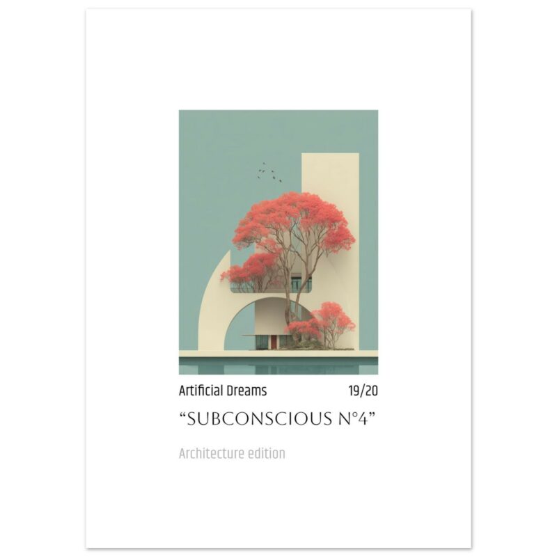 Immerse yourself in the tranquility of “Subconscious N°4,” a captivating fine art poster that marries architectural minimalism with the vibrant beauty of nature. This piece, part of our Artificial Dreams collection, features striking pink-hued trees set against a serene, light blue sky and elegant, curved modern structures. It’s an ideal choice for those who appreciate contemporary aesthetics and a touch of surreal calm in their living spaces.