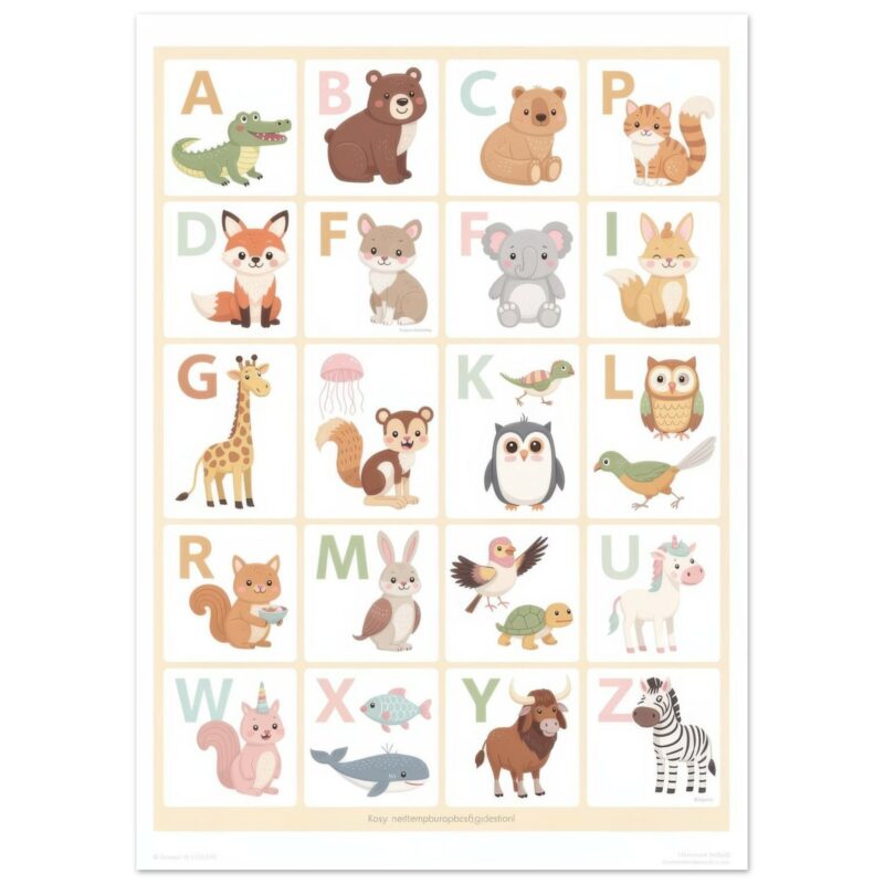 Cute Animal Alphabet Nursery Wall Art Print – Pastel ABC Poster for Kids Room