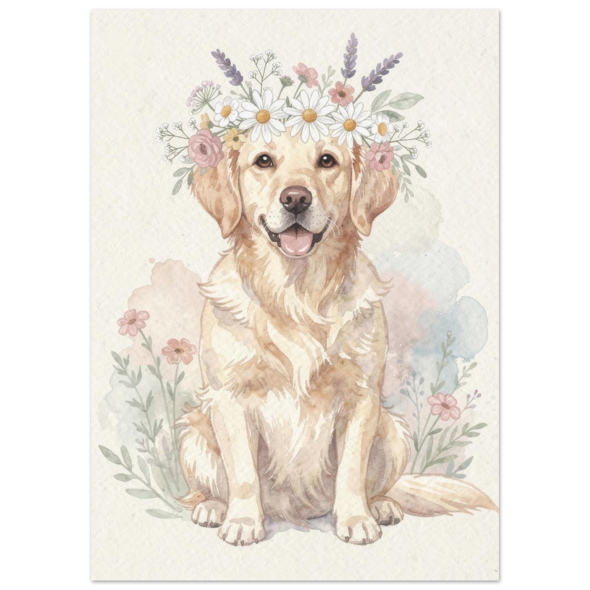 Charming watercolor illustration of a smiling Golden Retriever wearing a beautiful floral crown of daisies, lavender, and roses. This soft, pastel-toned pet portrait features delicate botanical accents and a dreamy watercolor background, perfect for nurseries, living rooms, or any dog lover’s space. Available as a high-quality print-on-demand wall art piece.