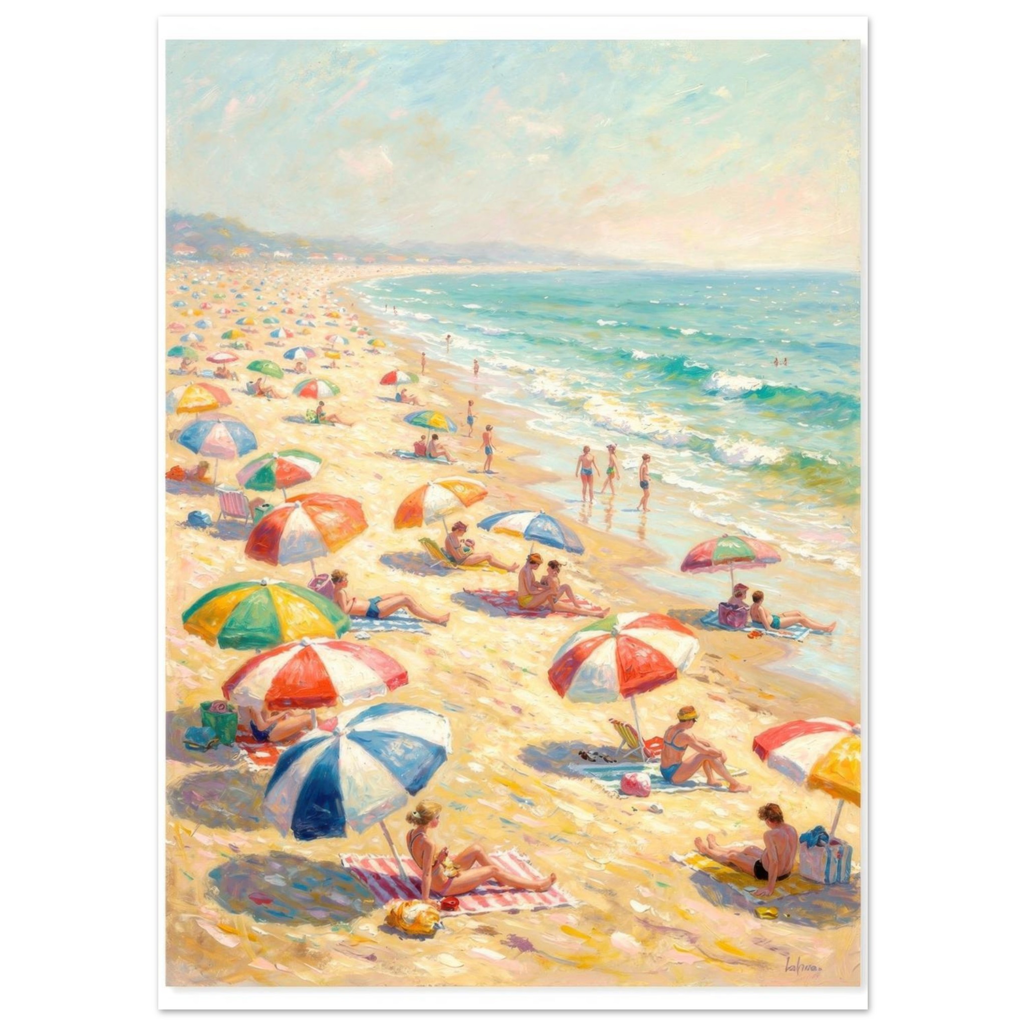 Beautiful impressionist oil painting depicting a vibrant crowded beach scene with colorful striped umbrellas, sunbathers, and turquoise ocean waves. This warm, sunny coastal artwork features a stunning elevated perspective along a long sandy shoreline dotted with beachgoers enjoying a perfect summer day. Ideal for coastal home decor, living rooms, bedrooms, and beach house interiors.