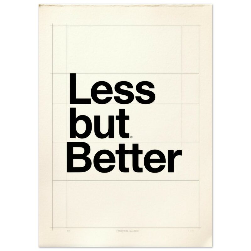 Less But Better minimalist typography wall art featuring the iconic Dieter Rams design philosophy quote in bold black sans-serif type on a clean off-white background with subtle grid lines. Perfect for modern offices, studios, and minimalist living spaces. A tribute to functionalist design principles and the ‘weniger aber besser’ ethos.