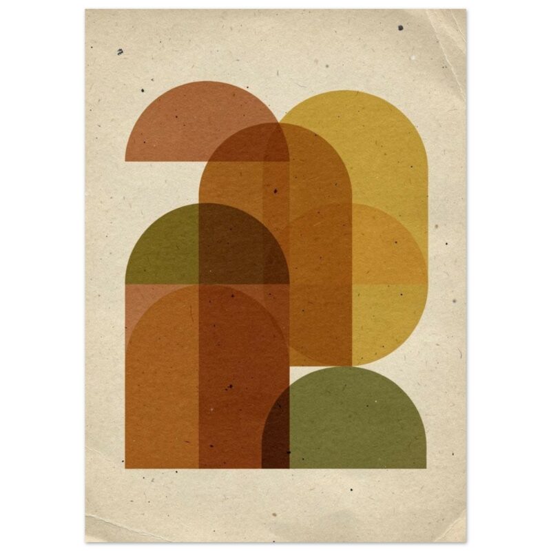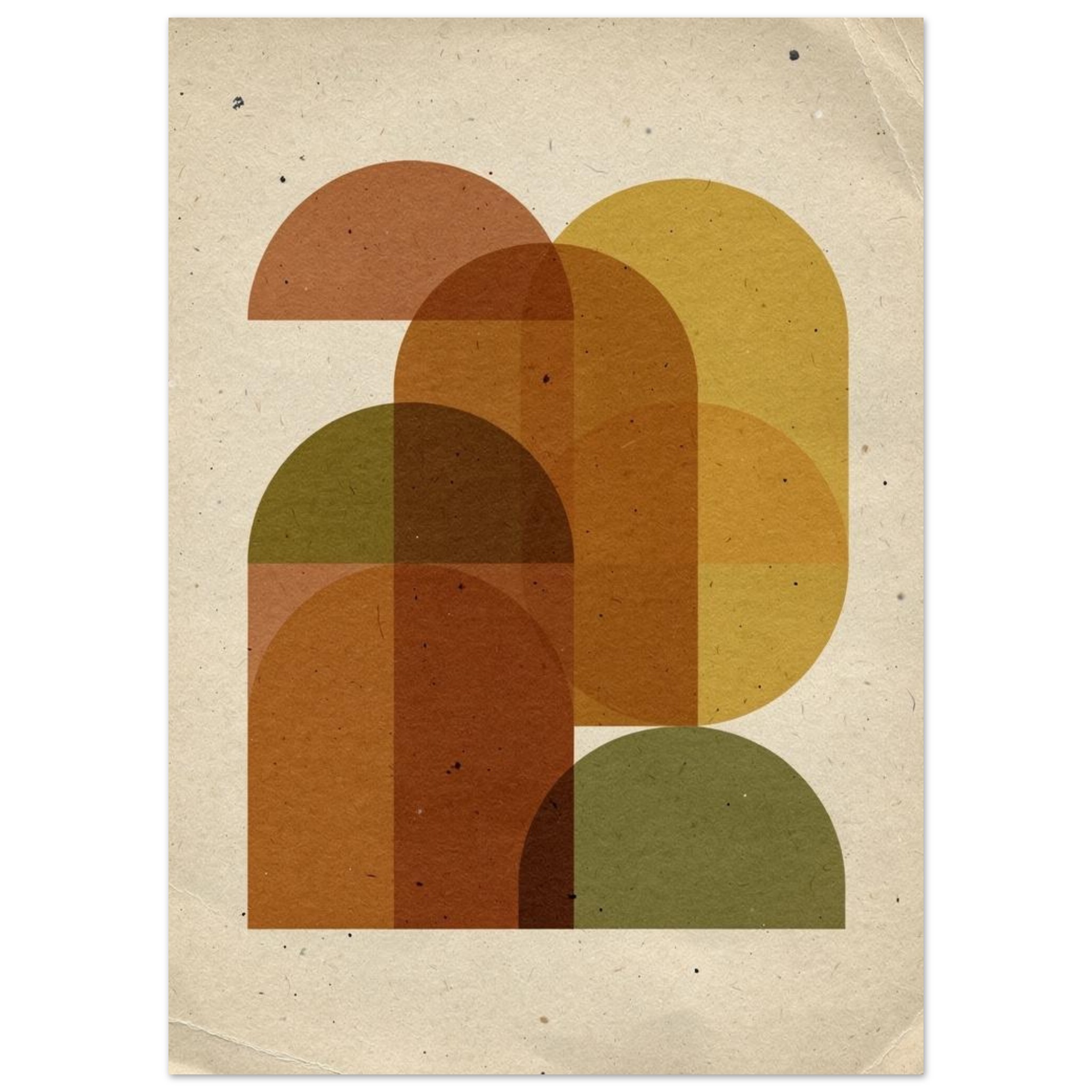 A beautifully composed mid-century modern abstract art print featuring overlapping geometric arches and semicircles in warm earth tones. Rich terracotta, olive green, mustard yellow, and burnt sienna shapes layer with translucent blending effects on a vintage textured paper background. Perfect for adding warmth and retro sophistication to any living room, bedroom, or office space.