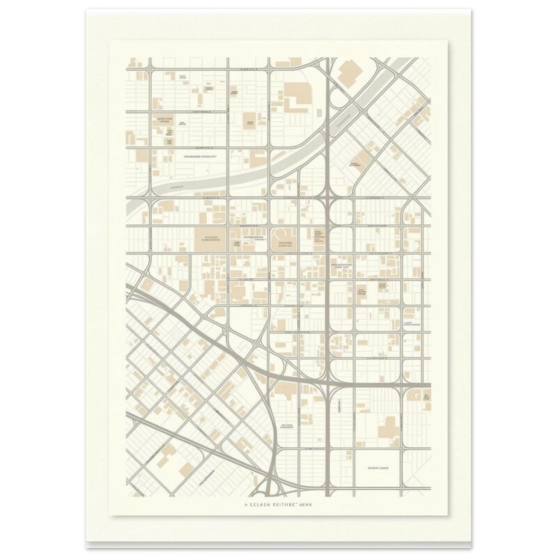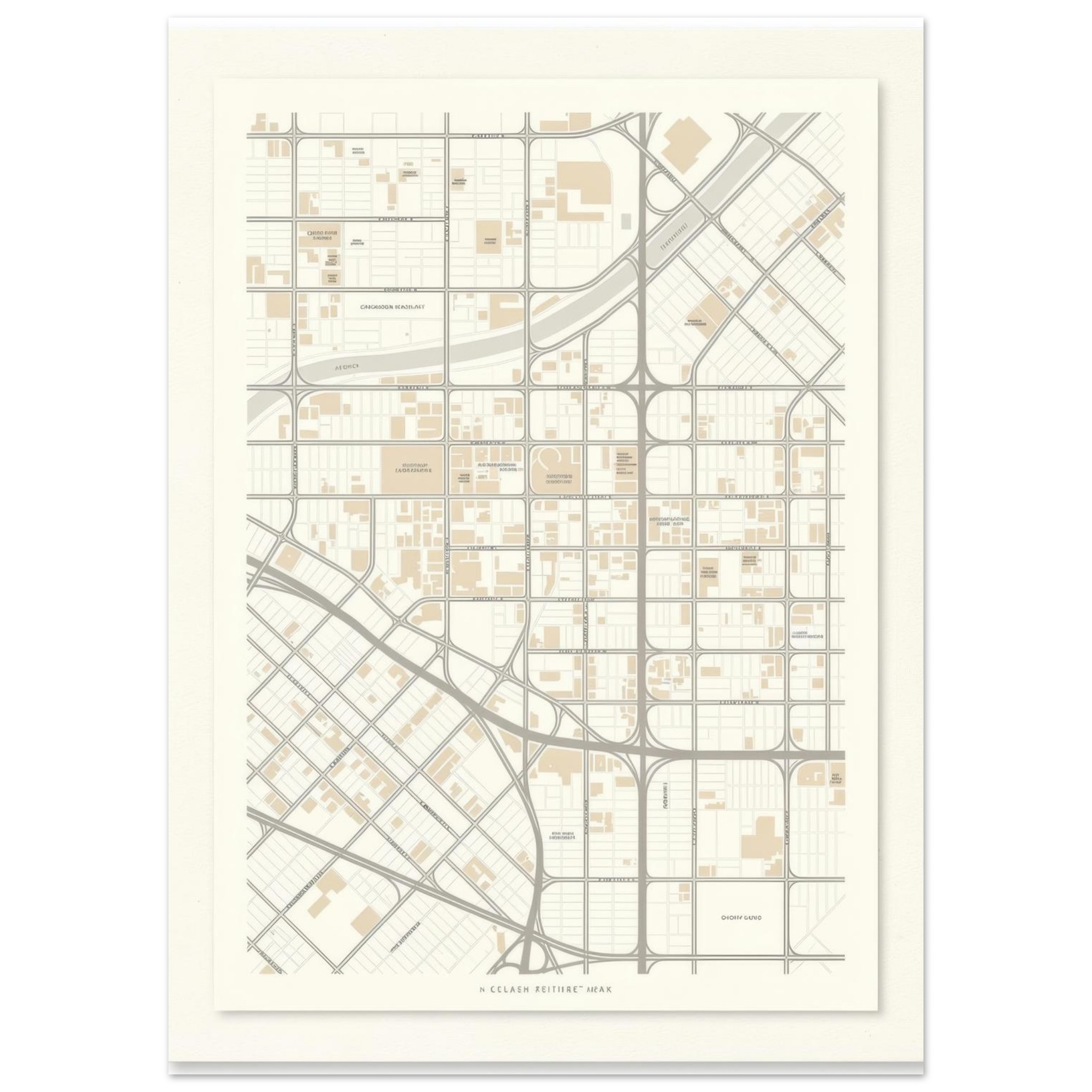Modern minimalist city map art print featuring a clean urban street grid design in soft beige and gray tones. This contemporary cartographic wall art showcases detailed city blocks, highway interchanges, and labeled landmarks in a sophisticated neutral color palette. Perfect for modern home decor, office spaces, and urban-inspired interiors.