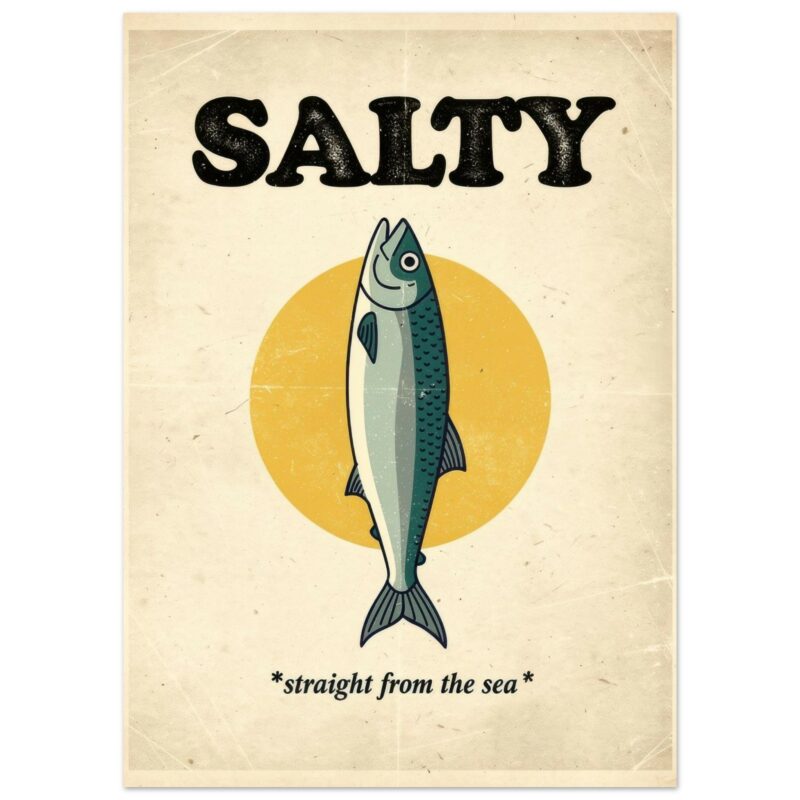 Add nautical charm to your space with this vintage-style ‘Salty – Straight From The Sea’ fish poster. Featuring a retro illustrated fish against a golden sun circle with bold distressed typography, this coastal wall art print is perfect for kitchens, beach houses, seafood restaurants, and nautical-themed rooms. Printed on high-quality material for lasting appeal.