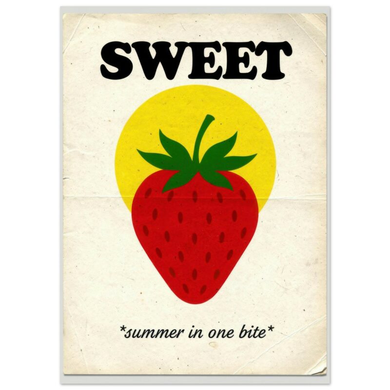 Charming retro-style strawberry art print featuring bold ‘SWEET’ typography, a vibrant red strawberry illustration with yellow sun backdrop, and the playful tagline ‘summer in one bite.’ This vintage-inspired minimalist fruit poster brings mid-century modern charm to any kitchen, dining room, or café space with its warm color palette and nostalgic paper texture.