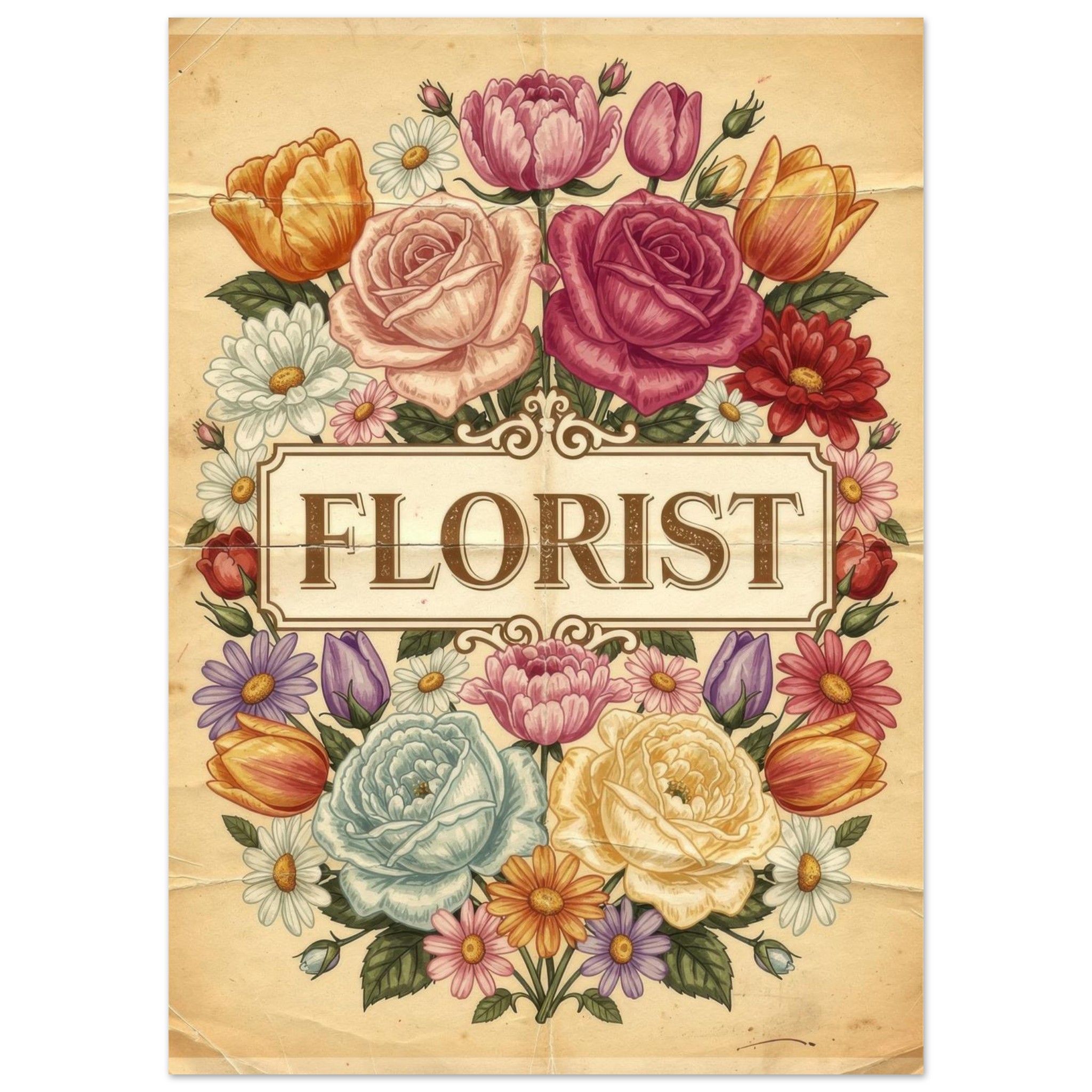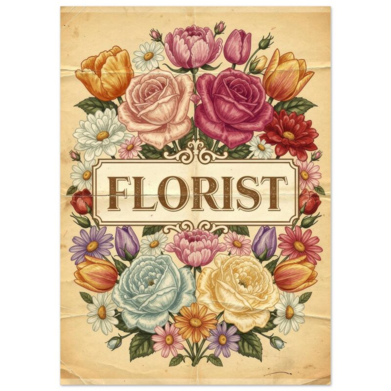 Charming vintage-style florist illustration featuring a lush arrangement of hand-drawn roses, tulips, daisies, and chrysanthemums surrounding an elegant ‘FLORIST’ typographic sign on aged parchment. This Victorian-inspired botanical print brings timeless floral beauty and old-world charm to any space, perfect for flower shop decor, kitchen walls, or cottage-style interiors.