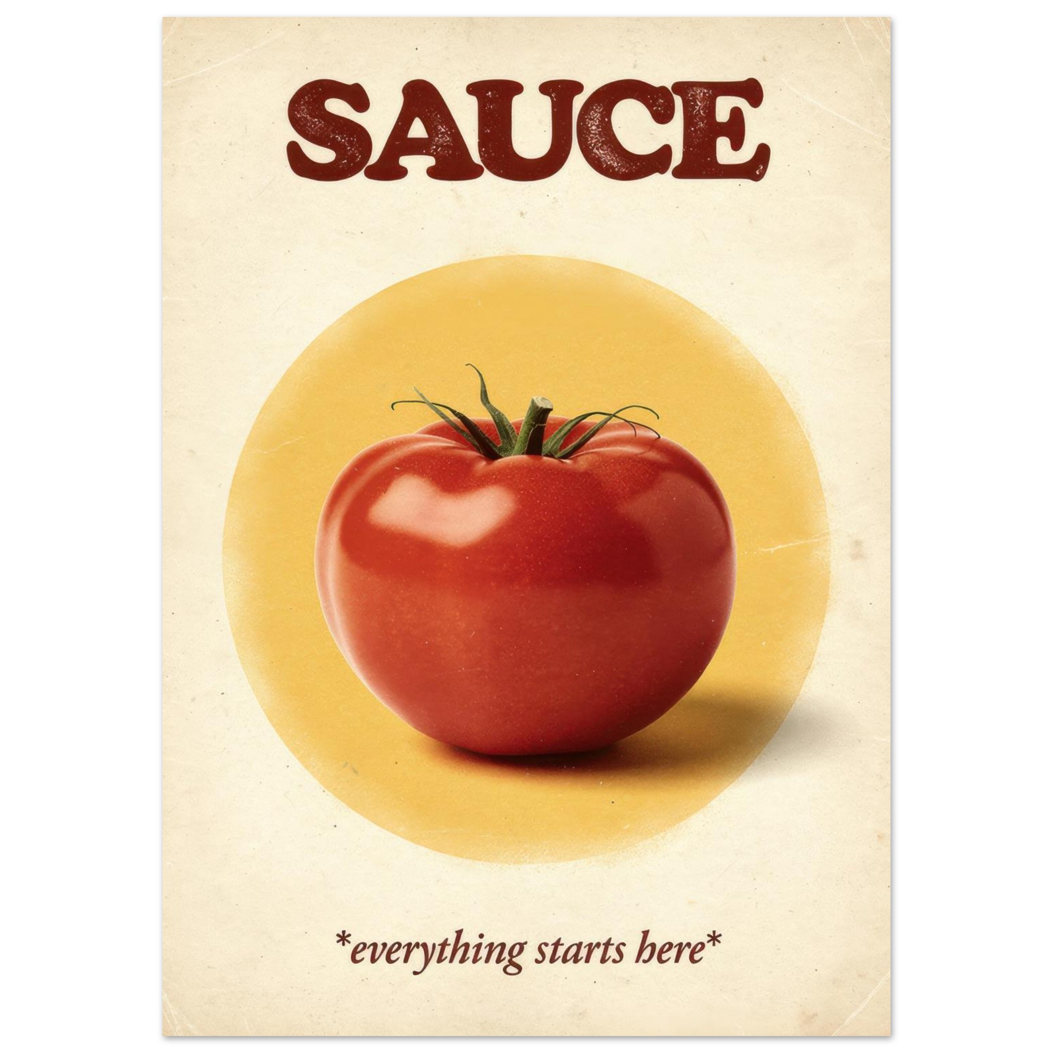 Charming vintage-style tomato sauce poster featuring a vibrant red tomato on a warm yellow circle background with distressed typography reading ‘SAUCE’ and the tagline ‘everything starts here.’ Perfect retro kitchen wall decor for food lovers, home chefs, and Italian cuisine enthusiasts.